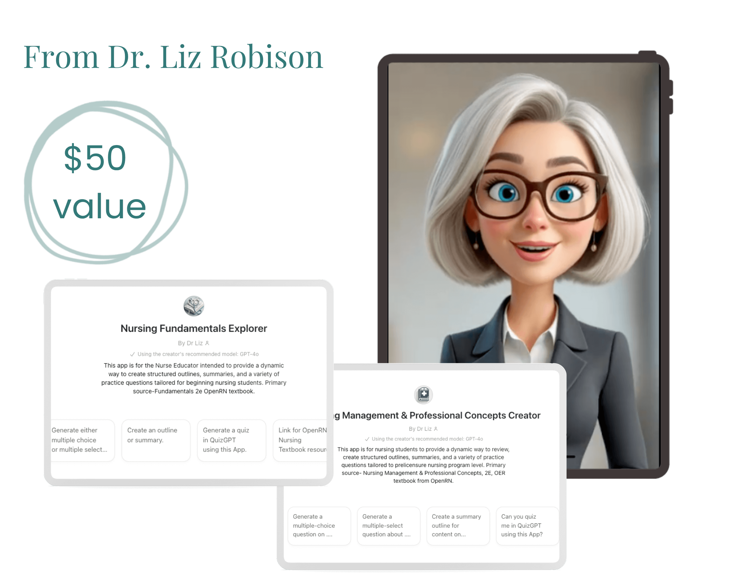 These GPT-powered apps act as your fast, reliable virtual assistants, designed specifically for nurse educators. Developed by Dr. Liz, an experienced nursing faculty member who understands the workload and demands of teaching, these tools integrate seamlessly with your existing program materials rather than replacing them.